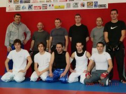 Depuis le mois d'octobre une dizaine de pratiquants peut profiter de l'expérience de Jean-Jacques JOUIN en matière de techniques de Jujitsu Combat et de Self-Défense, puisque cet enseignant BE, 4° dan a été pendant 3 ans instructeur à l'E.N.A.P. d'Agen. A la différence du Jujitsu traditionnel les cours se font en survêtement ou en tenue de loisir. En effet le port du kimono n'est pas autorisé car les saisies seraient trop facilitées et la pratique doit correspondre à des situations de défense de la vie courante. Par soucis d'hygiène chaque élève doit posséder ses protections et ses gants, d'autant que ce matériel devient vite indispensable lorsque le cours évolue vers le combat libre. Bien sur le club met les 'paos' à leur disposition pour les séries de frappe et nous fournissons les protections au débutants pour les séances d'essai. Enfin Jean-Jacques se fera un plaisir de renseigner les futurs adhérents pour l'achat et l'entretien de ces protections. Ce groupe motivé s'enrichit parfois de la présence de jeunes compétiteurs désireux de s'initier à cette discipline pratiquée sans judogi et ils sont souvent reconnaissables à leur pantalon blanc...