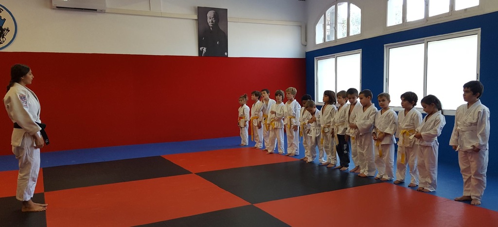 Très sérieux avant le début du cours les 15 élèves (+ 1 non cadré) attendent le signal pour se mettre en "zarei" avant de faire le salut.