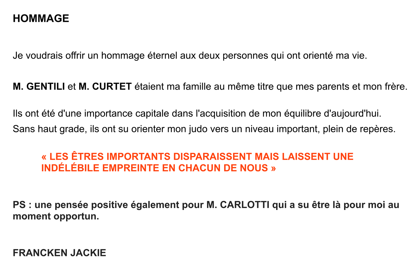 Très touché, moi qui suis le dernier de ce triumvirat, par le mail reçu d’un de nos meilleurs élèves des années 70, Jackie FRANCKEN, 5e dan.