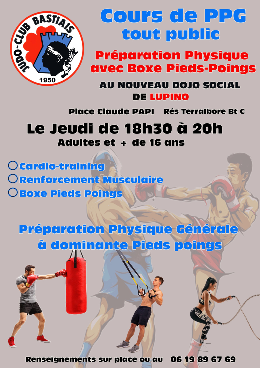 Le cours tout public de PPG (Préparation Physique Générale ) à dominante pieds poings est de retour cette année au Dojo de Lupino.