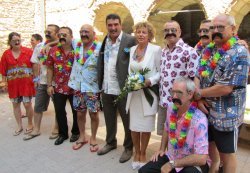 Michel et Kathy ont du faire une drôle de tête en voyant tous leurs meilleurs amis judokas "déguisés" en clones du marié arrivant aux stages d'été (chemise à fleurs, short, claquettes et, bien sur, moustache). Il faut dire que la bonne humeur était au rendez vous et le sérieux de mise lors de la deuxième cérémonie qui s'est déroulée dans le dojo avec tous les invités judokas en kimono. Le passage sous la haie de ceinture a été conclu par une projection de la charmante épouse vers de belles années de bonheur... en judogi.