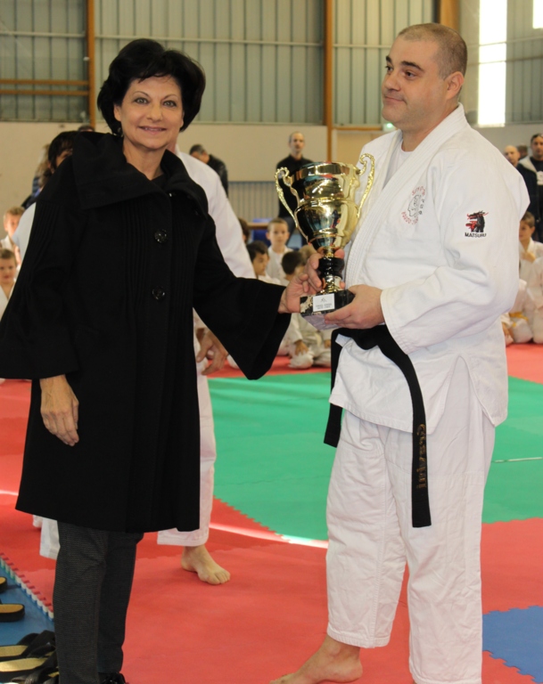 Une fois n'est pas coutume, car c'est en début de rencontre que Mme Lucienne CARLOTTI-GENTILI a remis la coupe à M. Tony GRAVINI le président du club de BORGO qui a remporté le challenge au "plus grand nombre de participants" avec 31 enfants présents (pour éviter la "championite"). Sachez que nous n'étions pas concernés par cette récompense malgré nos 51 combattants.