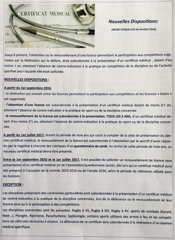 Ci joint les nouvelles dispositions pour la présentation du certificat médical d'aptitude. Notez que le Judo ne fait pas partie des sports de combats à risque. Tant mieux!