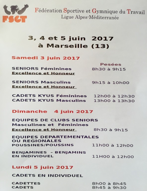 Le club sera bien représenté aux championnats de France FSGT puisque nous déplacerons à Marseille nos équipes seniors F et M (sans renfort), nos Cadets CN et quelques Cadets Kyu.