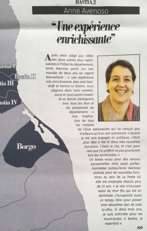 Anne AVENOSO n’est plus Conseillère Départementale depuis le début de l’année suite à mise en place de l’Assemblée unique et la disparition des deux Conseils Départementaux de l’île.