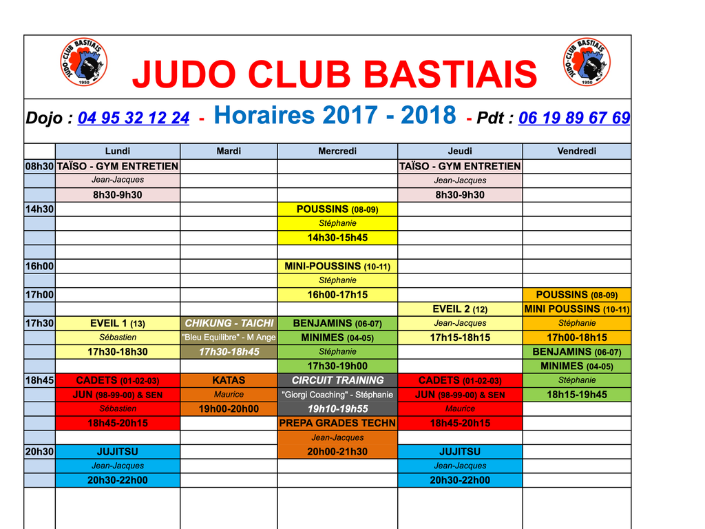 Vous constaterez que Jean-Jacques crée un cours de Préparation aux Grades Techniques le Mercredi a 20h et deux cours de Taïso les Lundi et Jeudi matin à 8h30.