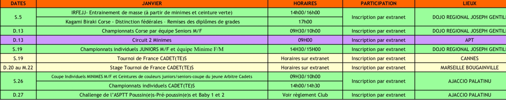 Voici les CHAMPIONNATS de CORSE FFJ programmés durant le mois de janvier : - SENIORS : Équipes et Ceintures couleur - JUNIORS : Individuels et Ceintures couleur - CADETS : Individuels - MINIMES : Équipes et Individuels