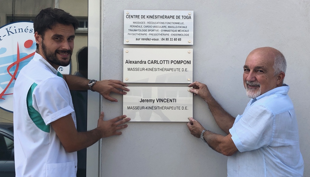 Ça y est, j’ai déposé ma plaque professionnelle et l’ai remplacée par celle de mon successeur Jérémy VINCENTI, qui sera également le nouveau kiné du club et l’associé de ma fille Alexandra.