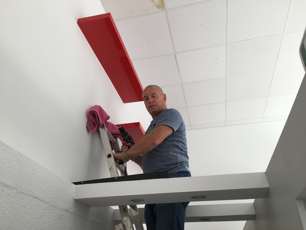 Une partie de la centaine de coupes qui sont encore dans notre réserve va, enfin, pouvoir être exposée grâce à Maurice qui a terminé de poser ces nouvelles étagères.