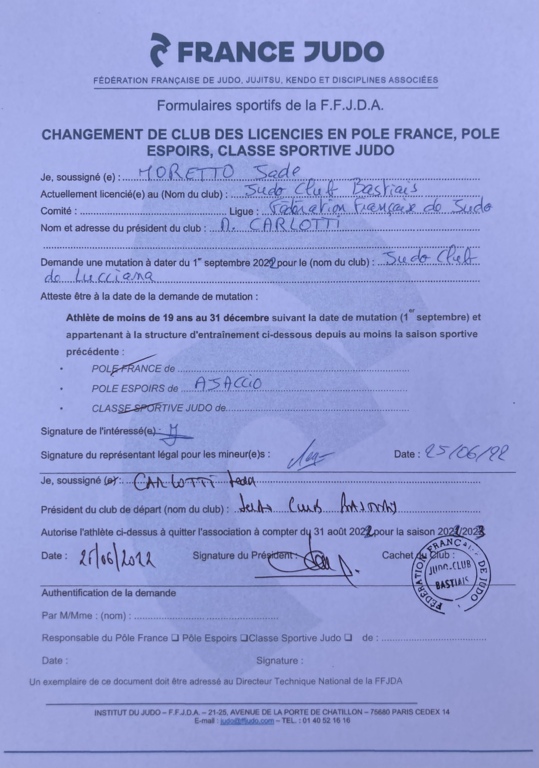 Je viens de signer l’autorisation de changement de club de Jade qui a fait le choix de se licencier dans un club plus proche de son nouveau domicile.
