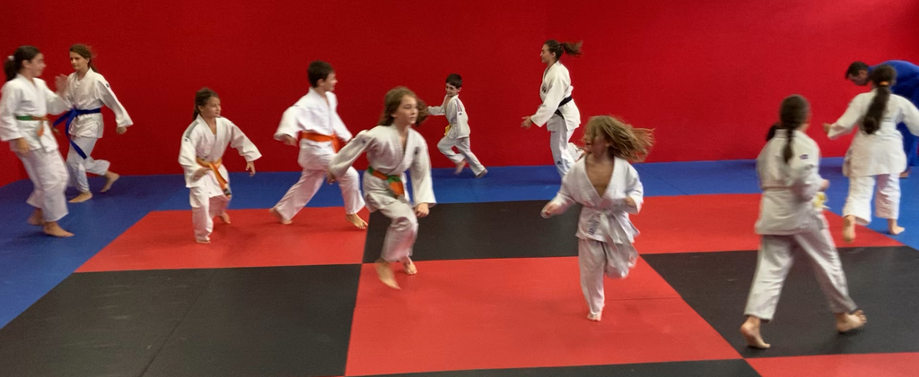 22 élèves sur 24 avec Jean-Ba et ses jeunes assistantes Diana et Lelia. Fin d’échauffement avec le jeu du Loup 🐺